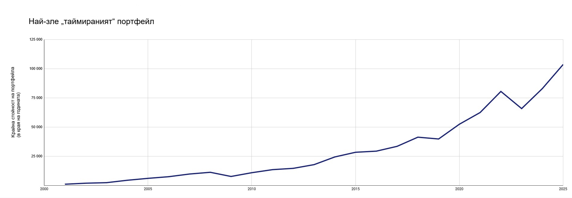 До 2025 г. ситуацията се повтаря. Нашият инвеститор очаква единствения ден, когато ще вземе своето инвестиционно решение. С безпогрешна точност той го прави точно когато цените на акциите, които през годината са достигнали своя връх, започват да падат. През 2008 г. – с цели 48%, през 2020 г. – с 34%. В 15 от 26 случая той трябва да понесе двуцифрени загуби.
